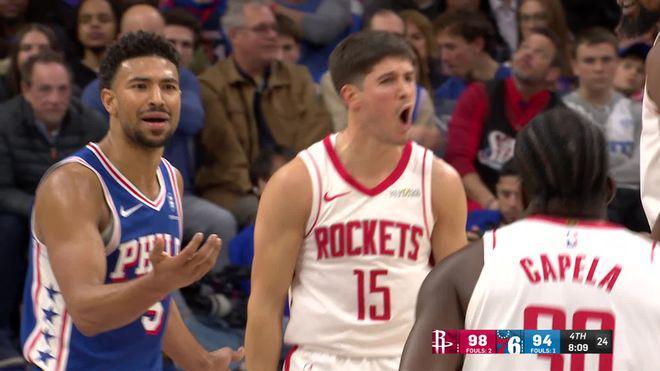 史密斯持球单打,恩比德把球切掉,马克西突破打进,伊森再中三分,乔治左侧0度角投中三分,马克西中投得分,第四节还有1分30秒时76人队追成113平。杜兰特单打抛投命中,火箭队再次领跑。恩比德运球失误,杜兰特也出现失误,马克西跑投命中,第四节还有40.1秒时两队战成115平。杜兰特三分不中,乔治拿到篮板,76人队在还有13.2秒请求暂停。马克西突破上篮被杜兰特封盖,可慢镜头重放显示杜兰特封盖前球已经碰了篮板。裁判吹罚争球,比赛进入加时赛。